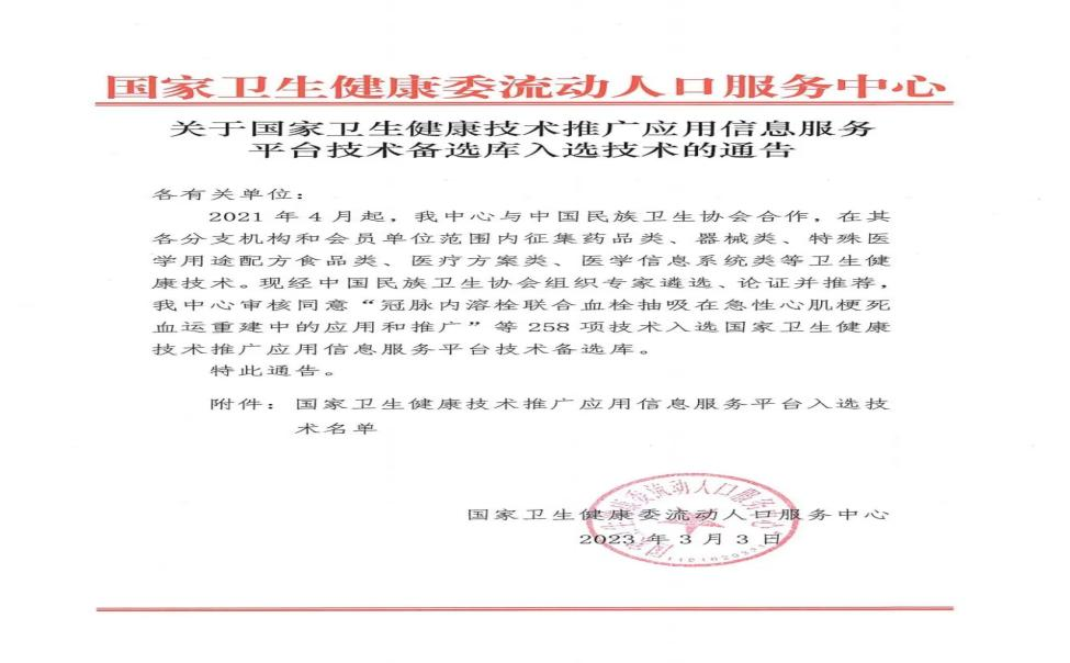 2023年3月3日,國家衛生健康委流動人口服務中心正式發文,成都思瑞迪“檢測精子唾液酸酶1/3的方法”入選國家衛生健康技術推廣應用信息服務平臺技術備選庫。