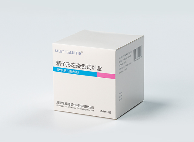 采用世界衛生組織(WHO)推薦方法配制的精子形態染色液,對精子涂片進行染色,精子頂體區、體部、尾部呈現不同的著色,評價人精子形態特征,觀察正常精子的形態百分比。